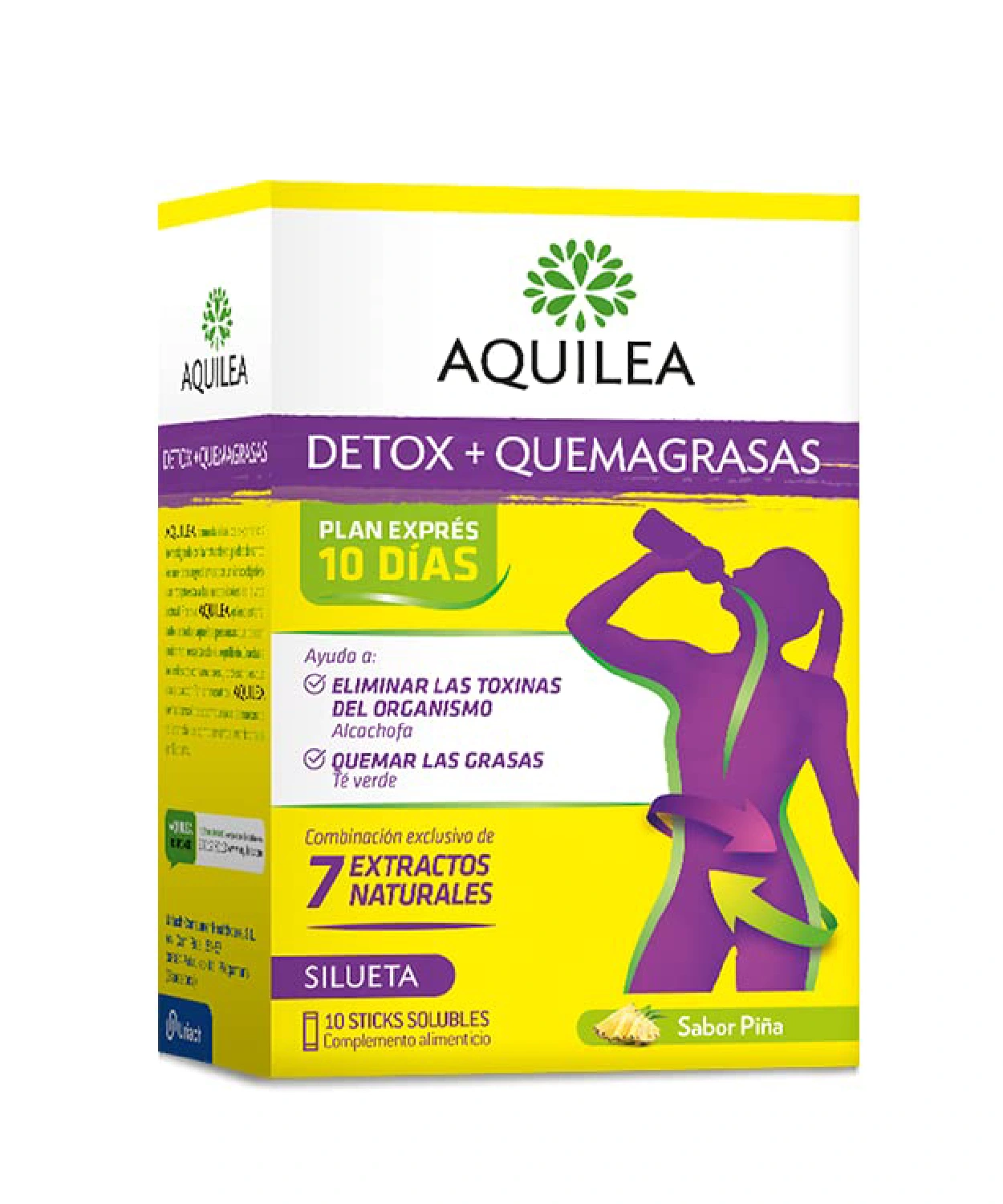 Aquilea Detox + Quemagrasas esta compuesto por 6 extractos naturales de plantas que permite en un plan exprés de 10 días mejorar la detoxificación del organismo, eliminar líquidos y ayudar a reducir la grasa acumulada. Dentro de la formulación la Cola de Caballo ayuda a una mayor evacuación de líquidos, el Pensamiento silvestre mejora la piel porque permite detoxificarla y el te verde permite el control del metabolismo de las grasas.