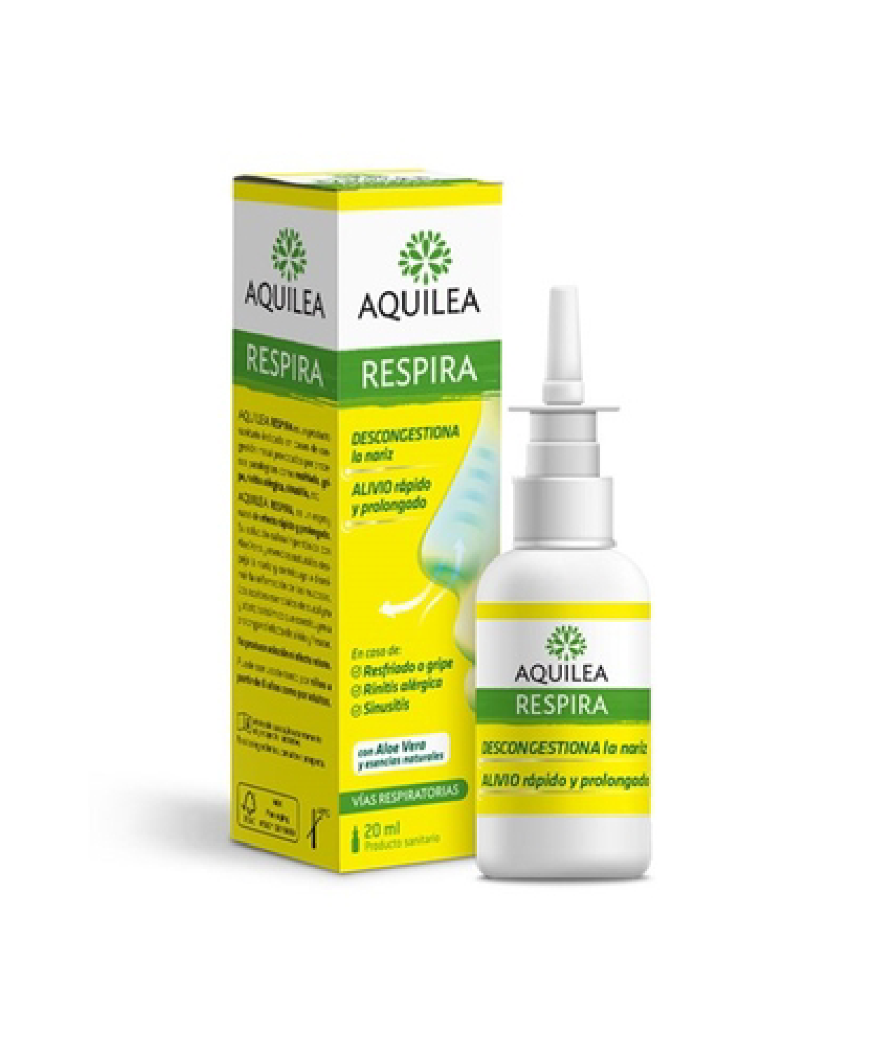 Para tratar los síntomas de congestiona nasal en procesos gripales, resfriados, rinitis alérgicas, sinusitis… el producto sanitario Aquilea Respira se formula con una solución salina hipertónica, Aloe Vera y aceites esenciales BIO de abeto y eucalipto. En formato de espray nasal, Aquilea Respira permite disminuir la inflamación, calmar y aportar frescor rápidamente y de forma prolongada en el tiempo. No produce adicción ni efecto rebote.