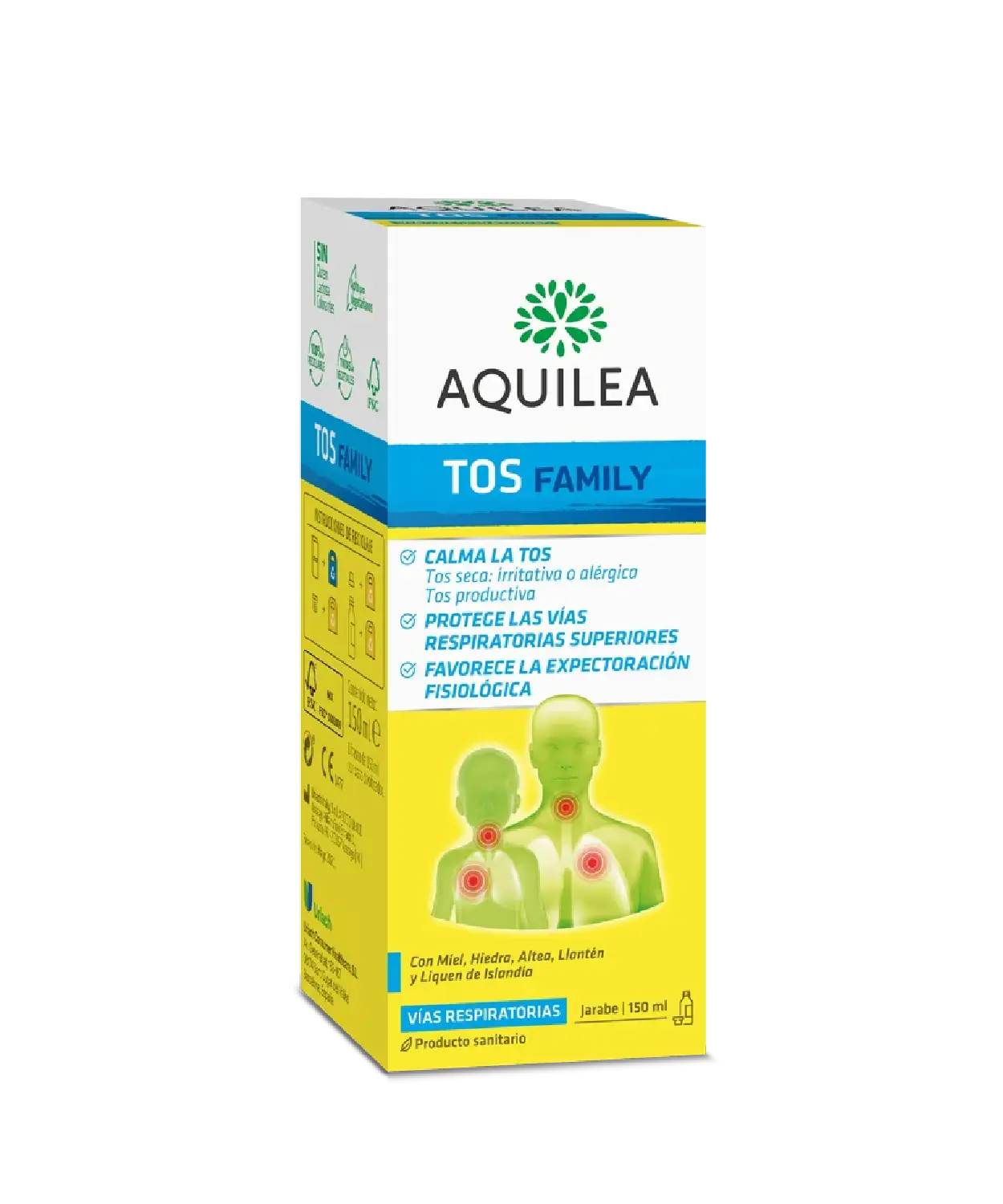 Aquilea Tos Family es un producto para toda la familia que, gracias a la presencia de extractos naturales con eficacia probada, crea una película protectora que calma la tos, protege de las irritaciones mejorando la funcionalidad de las vías respiratorias superiores.