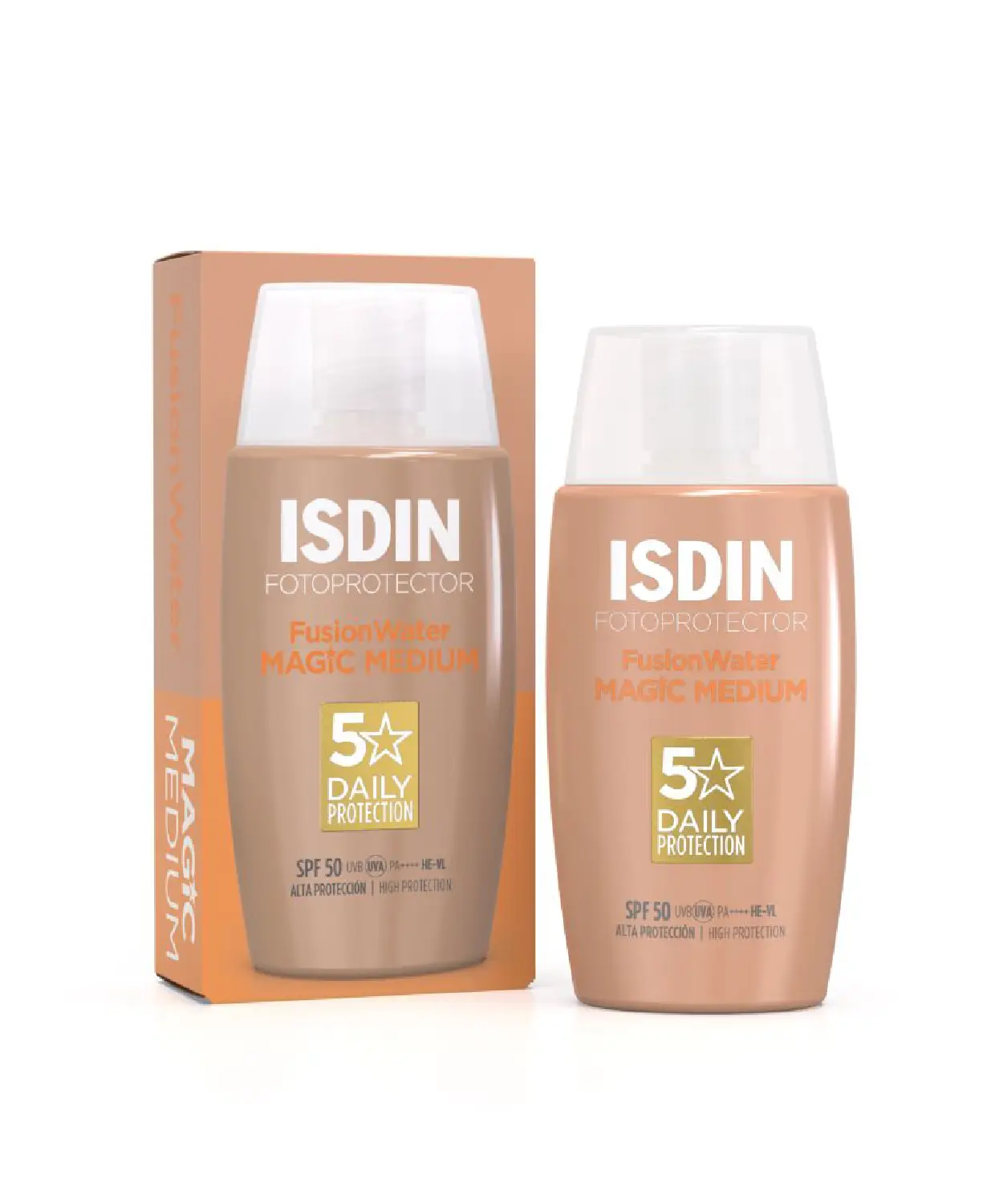 ISDIN Fusion Water MAGIC Medium SPF50 es un fotoprotector facial diario con color que combina una protección solar muy alta con un acabado natural y una textura ultrafluida de absorción inmediata.
