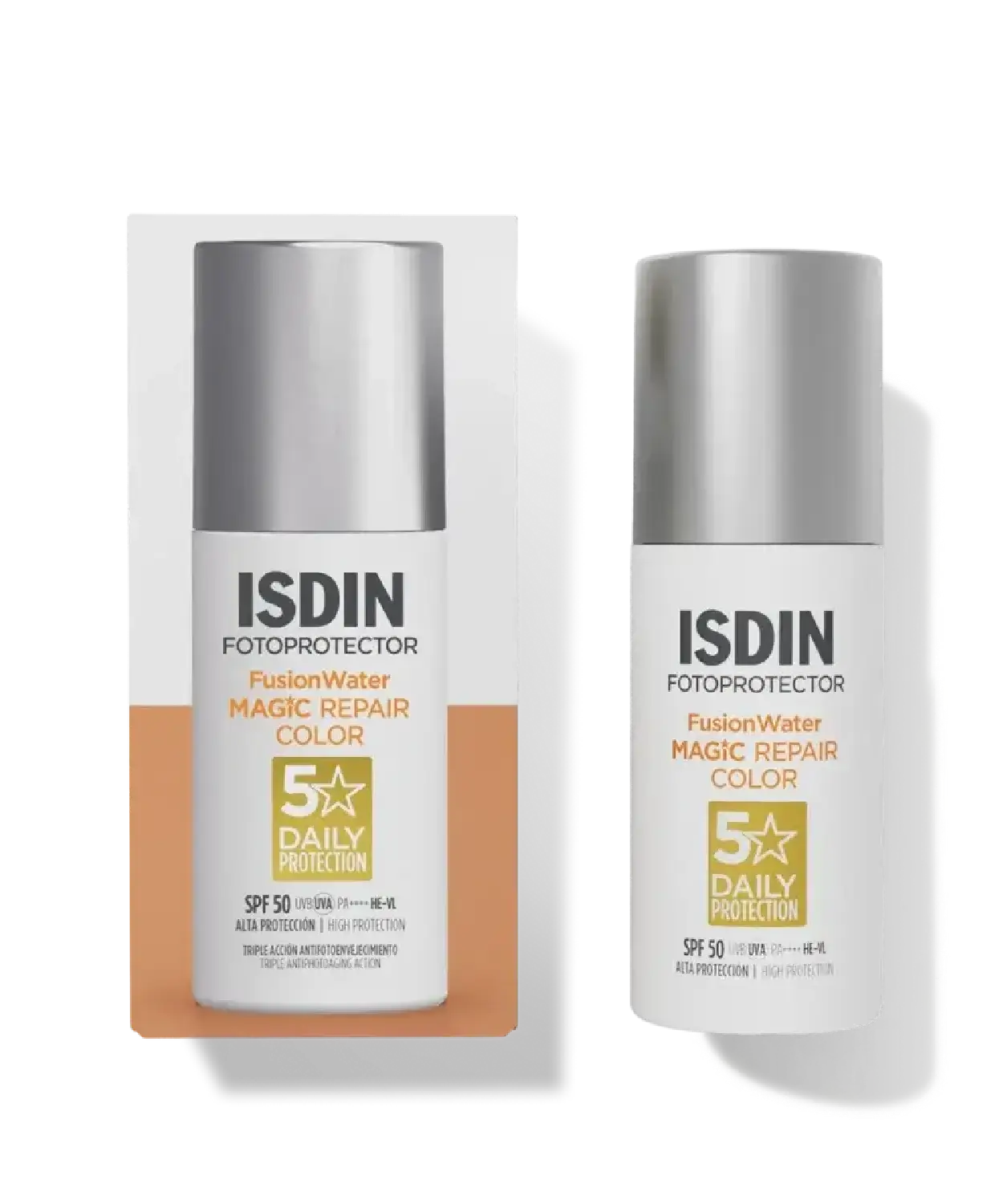 Protege tu piel del sol con Fusion Water MAGIC Repair Color SPF 50, el protector solar de textura ultraligera que proporciona una triple acción antifotoenvejecimiento.