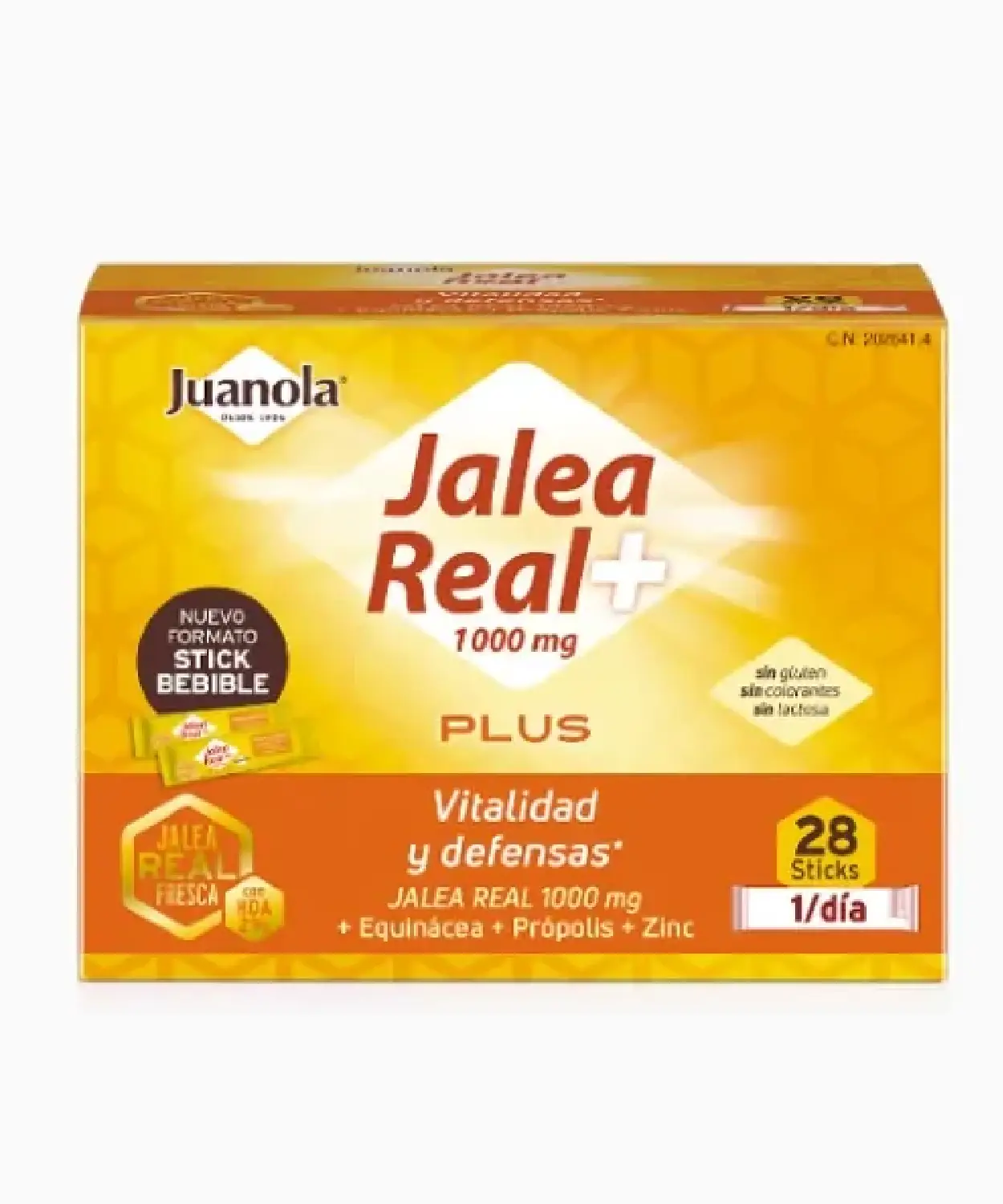 Juanola Jalea Real Plus es un complemento alimenticio en formato de sticks bebibles elaborados a base de jalea real fresca titulada al 2% en HDA, extracto seco de equinácea, extracto de própolis y zinc.