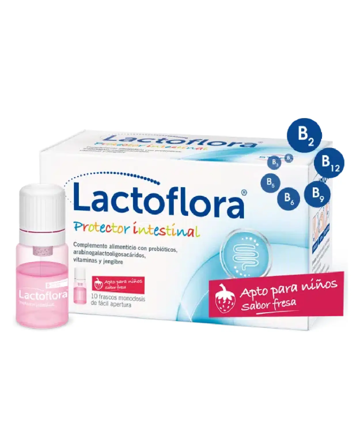 Lactoflora® protector intestinal infantil es un simbiótico (mezcla de probióticos y fibra prebiótica) con vitaminas y jengibre. Las vitaminas B6, B12 y el ácido fólico contribuyen al normal funcionamiento del sistema inmunitario. El jengibre contribuye al mantenimiento del bienestar gastrointestinal.