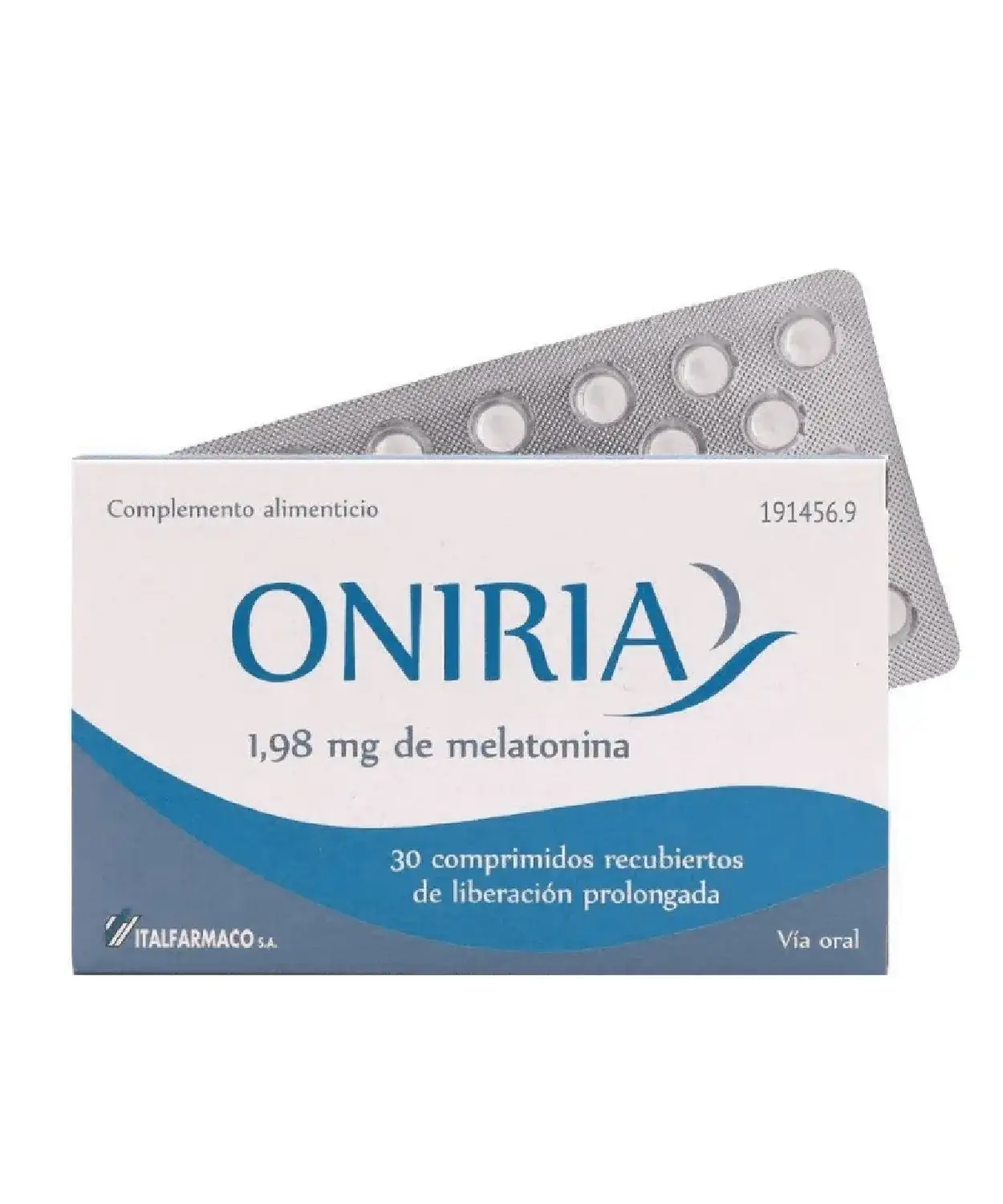 Oniria aporta 1,98 mg de melatonina en un comprimido de disolución controlada que actúa de manera gradual, ayudando a mejorar la calidad del sueño y a reducir el tiempo necesario para dormirse.