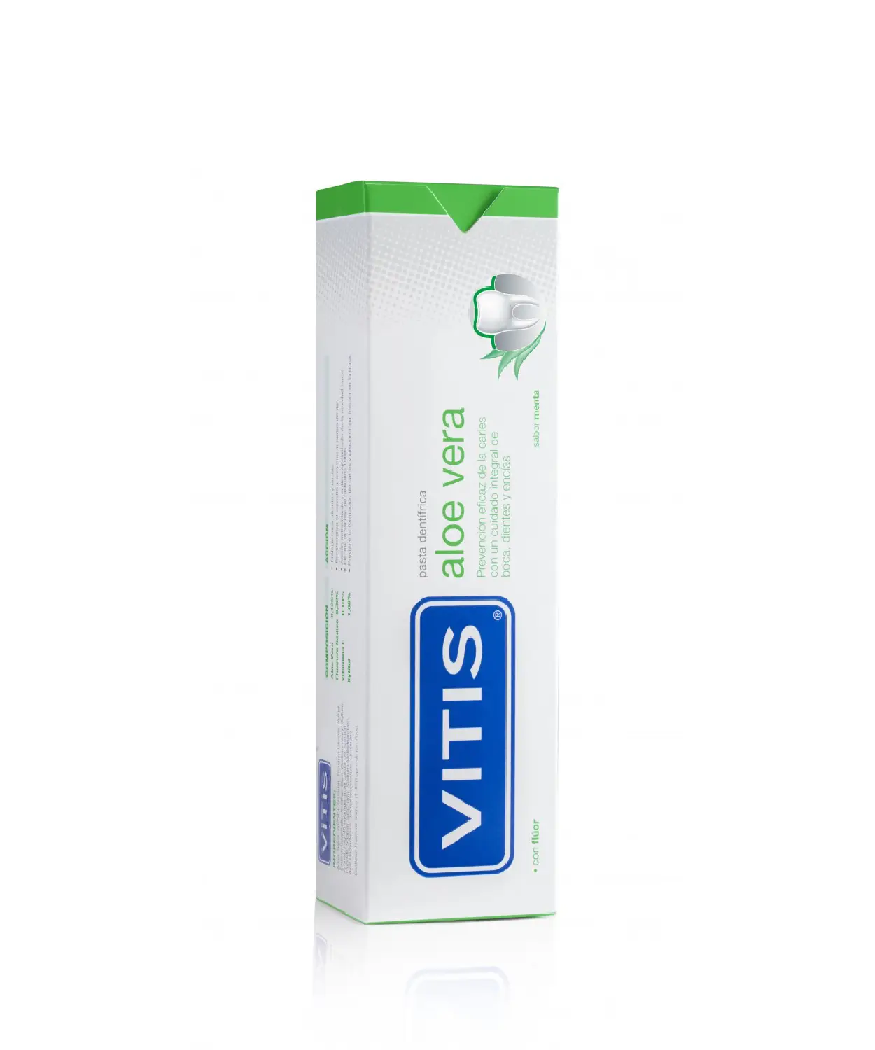 La pasta dentífrica VITIS® aloe vera sabor menta proporciona un cuidado integral de la boca, dientes y encías.