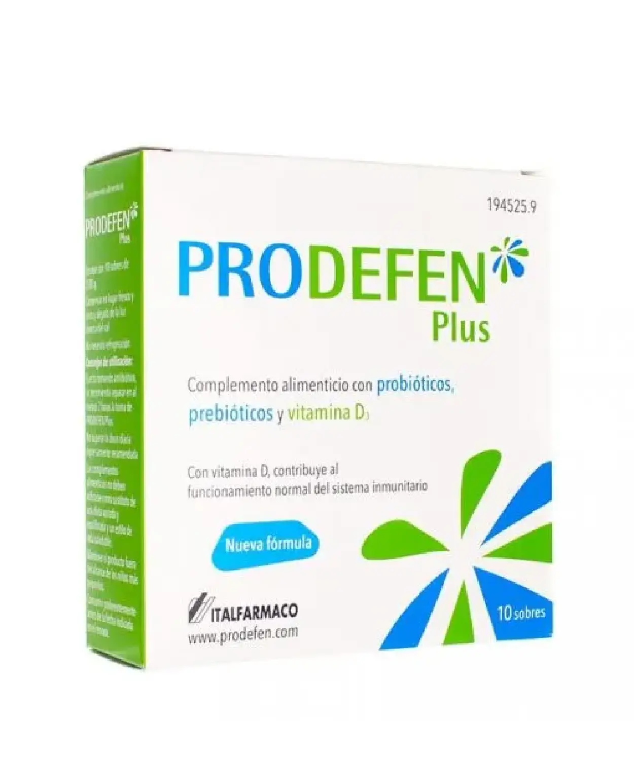 Prodefen Plus es un complemento alimenticio completo que combina probióticos, prebióticos y vitamina D3, formulado para favorecer el equilibrio intestinal y reforzar el sistema inmunitario de toda la familia.