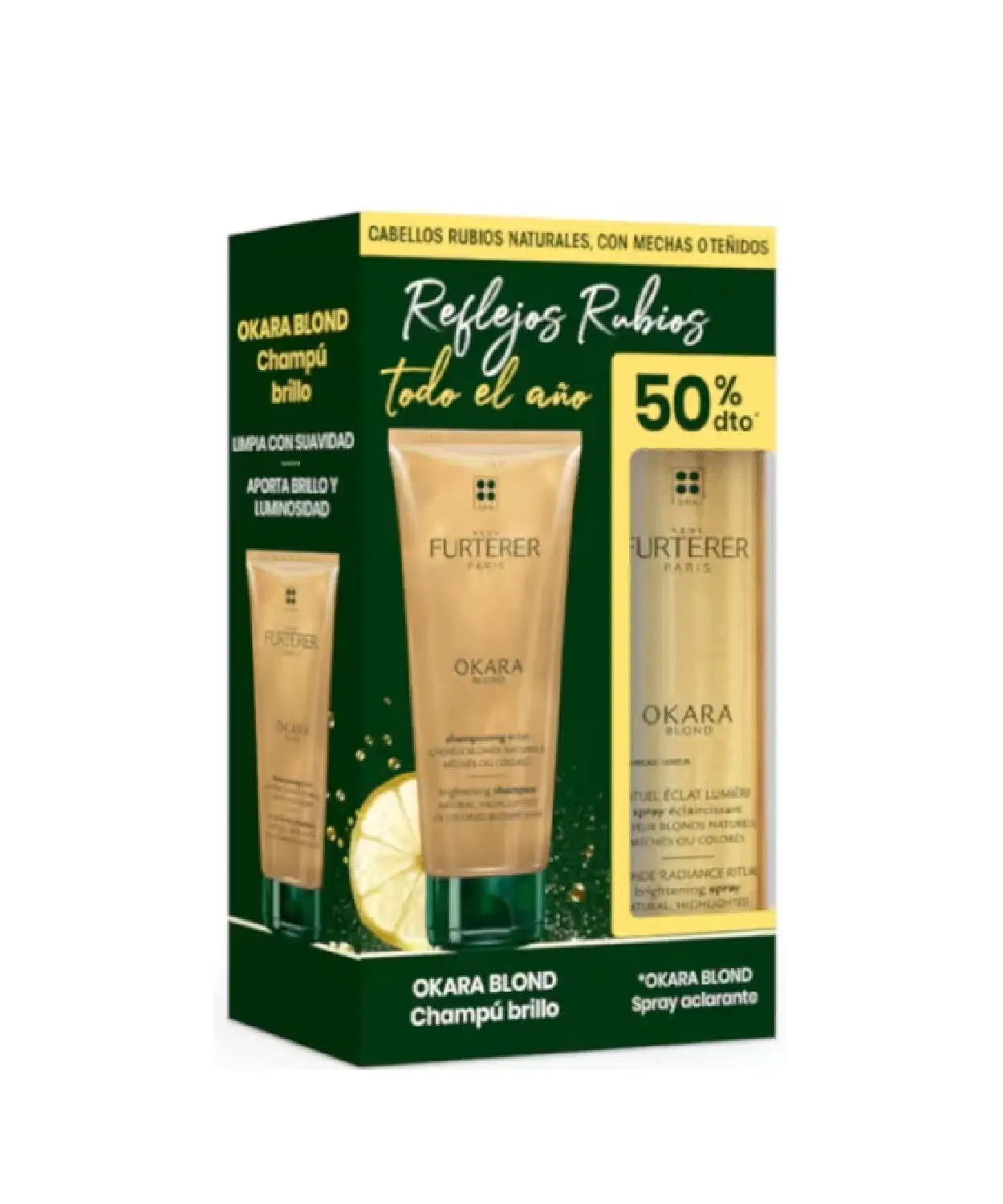 René Furterer Pack Okara Blond Champú Brillo + Spray Aclarante es el dúo perfecto para potenciar la luminosidad del cabello rubio, ya sea natural, teñido, con mechas o decolorado.