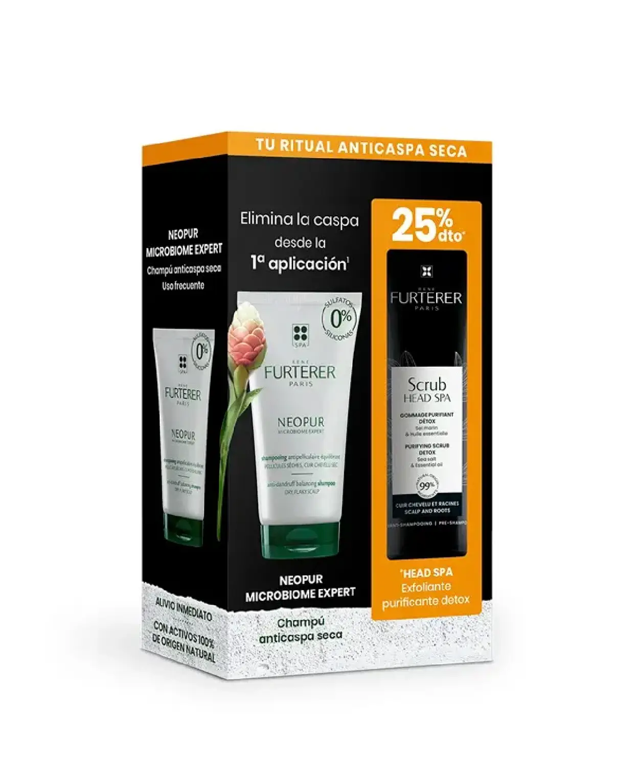 El Pack Rene Furterer Neopur Anticaspa Seco + Exfoliante Detox es el tratamiento ideal para restaurar el equilibrio, la hidratación y el confort del cuero cabelludo.