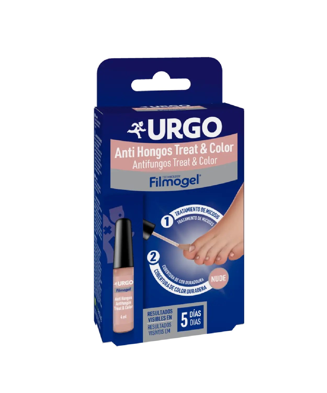 URGO Anti Hongos Treat&Color Filmogel a base de Olile-ActiveTM, un ingrediente patentado de origen natural. Forma una película de color que enmascara y trata los hongos de las uñas con una cobertura nude.